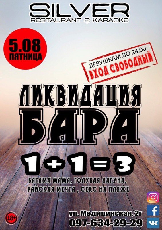 Пятница - это Silver. До 24:00 вход девушкам свободный. На баре действует акция на ТОПОВЫЕ КОКТЕЙЛИ 1+1 = 3